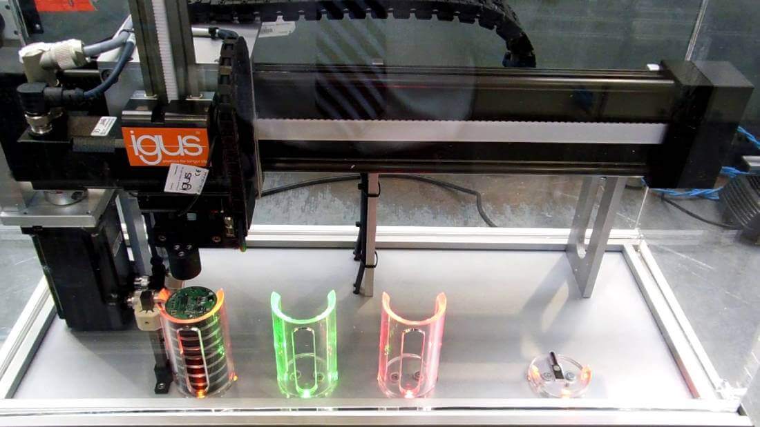 In this application, igus shows how error avoidance costs can be reduced creatively and simply with low-cost robotic solutions. In this case, the two degrees of freedom of the igus line gantry are perfectly sufficient to pick up the blanks with the help of a small parts gripper from Schunk, check them and pre-sort them into "out of order" and "in order". Most important, however, is the high throughput that we were able to achieve with this application. Within 2 months the project cost of 10.000€ was amortised. In addition, a compact application like this is an eye catcher at every trade fair.