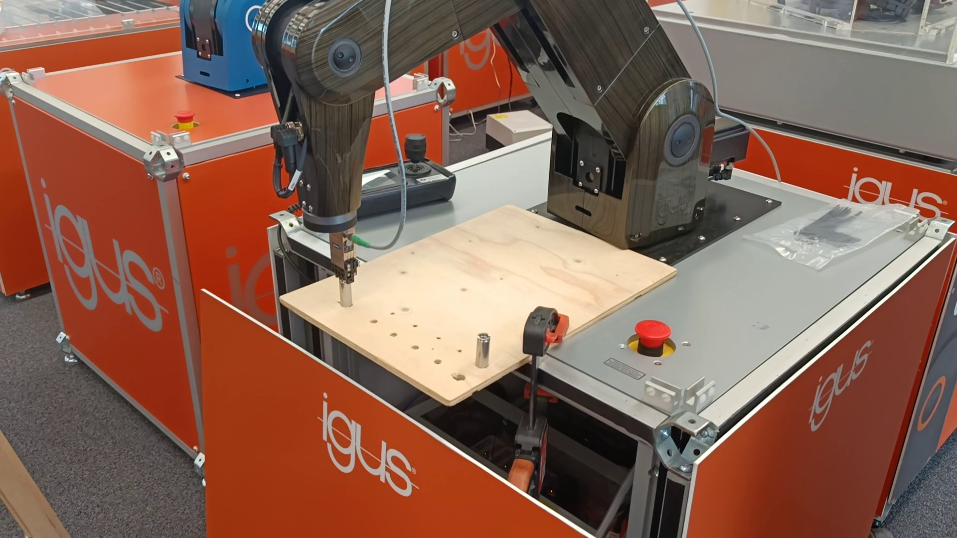 In this application, a Robolink DP 5-axis robot, on which a parallel gripper is mounted, picks up components and places them in a wood fixture. This is a preparation for the worker on the assembly line.
